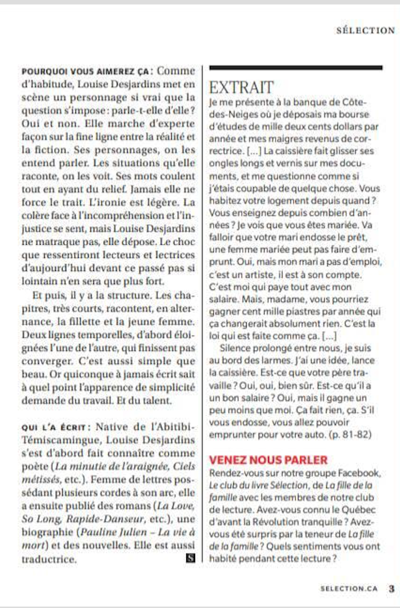 L'heure de pointe Toronto/Windsor avec Alison Vicrobeck, Radio-Canada, Ici Première: Louise Desjardins parle de son roman «La fille de la famille», extraits